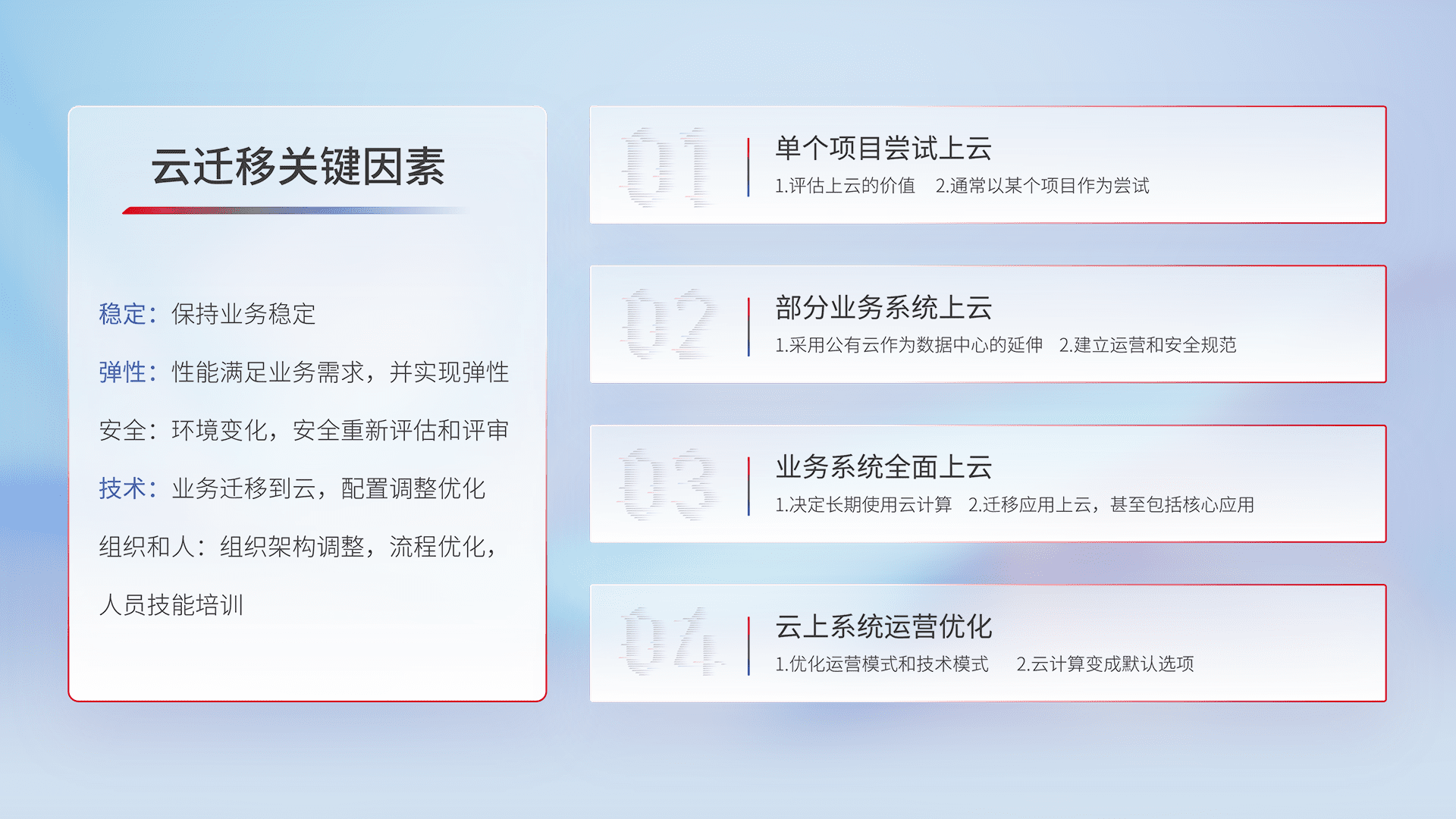 结合实际业务,,,从规划设计、、云平台选型、、、云原生改造、、、数据迁移、、、、集成交付,,,迁移全过程为客户识别最佳上云路径,,,做好风险识别管理,,,,设计网络架构、、身份权限、、、、安全审计合规、、、操作审计、、、、日志审计、、监控告警策略、、、、多站点容灾设计等,,,,对云上基础设施进行整体规划,,提升IT治理水平,,,以满足弹性、、、、高可用、、高性能的需求。。。。
