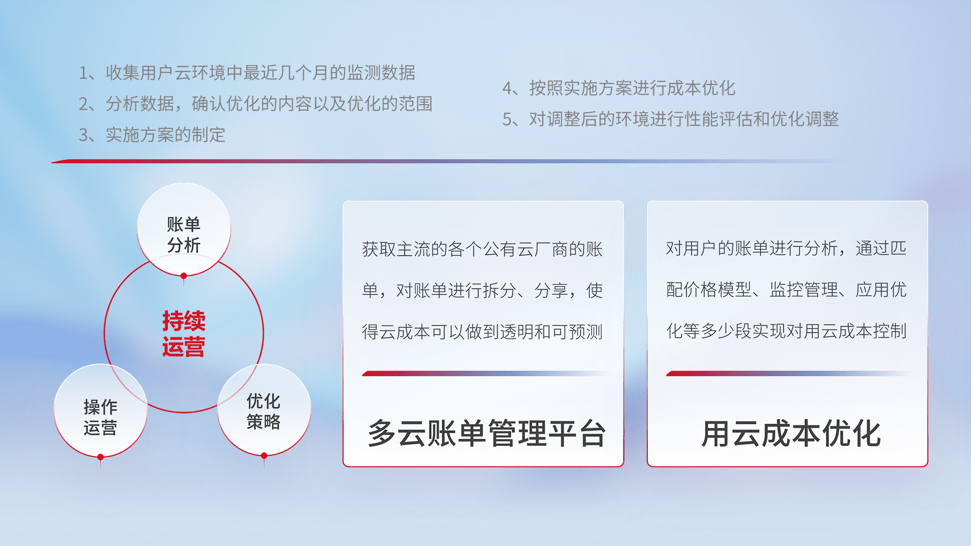通过多云纳管,,,,以统一的资源数据模型把客户的云资源进行抽象和封装,,,,进而实现对多云资源的统一操作,,保障云资源管理的可靠性、、、稳定性与可用性。。量身定制化运维内容,,,配置、、、开发运维、、、、补丁管理、、备份、、、监控、、、、认证和访问管理、、、审计和日常巡检等,,,,保障在用云过程中的可靠度,,,稳定度以及高可用率。。。