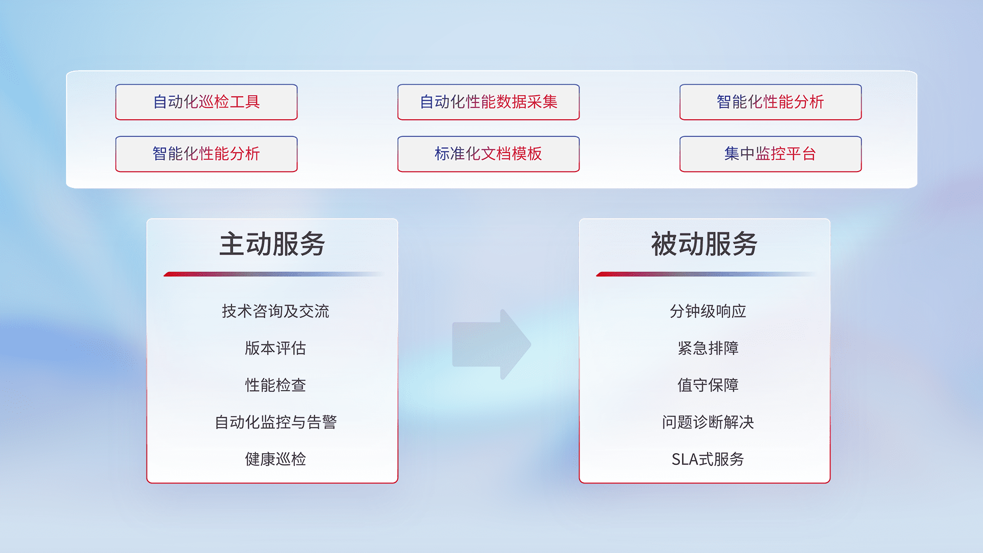 智能化工具和标准化文档,,保障服务质量,,,,提供主动服务(包含技术咨询、、、、版本评估、、、性能检查、、、自动化监控与告警、、、健康巡检)和被动服务包含(分钟级响应、、、、紧急排障、、、值守保障、、、问题诊断解决、、、、SLA服务)。。