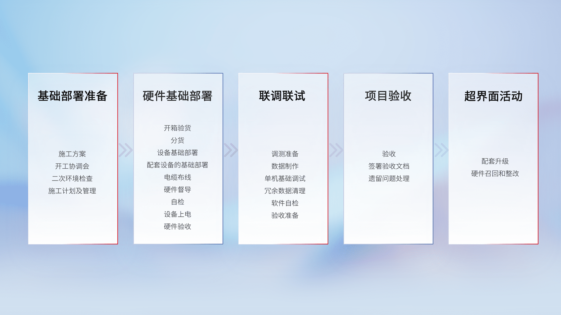从基础部署准备、、、、硬件基础部署、、联调联试、、、、项目验收、、、、越界面活动的全过程可追溯,,,保证施工质量和进度。。。。